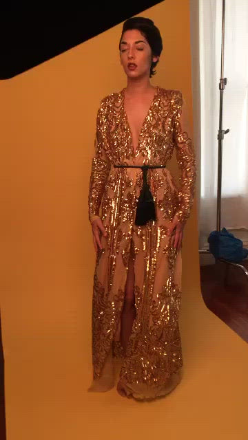 Long sleeve gold sequin dress with tassel rope belt.