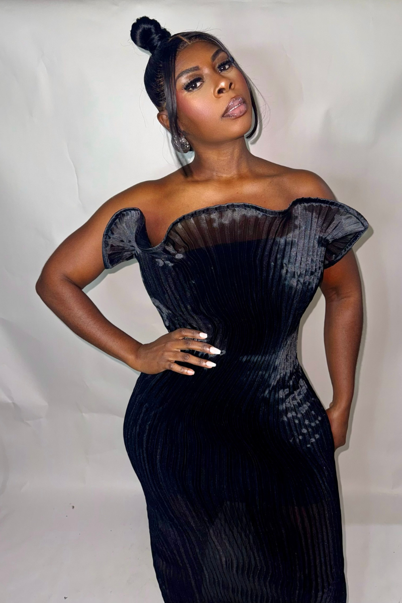 This dress is an elegant and refined piece with a modern sculptural twist. It features a Black color and is crafted from a sheer, pleated fabric and solid inner lining attached underneath that adds texture and visual rhythm throughout the entire silhouette. The dress is floor- length tube dress with a structured swirl hem.