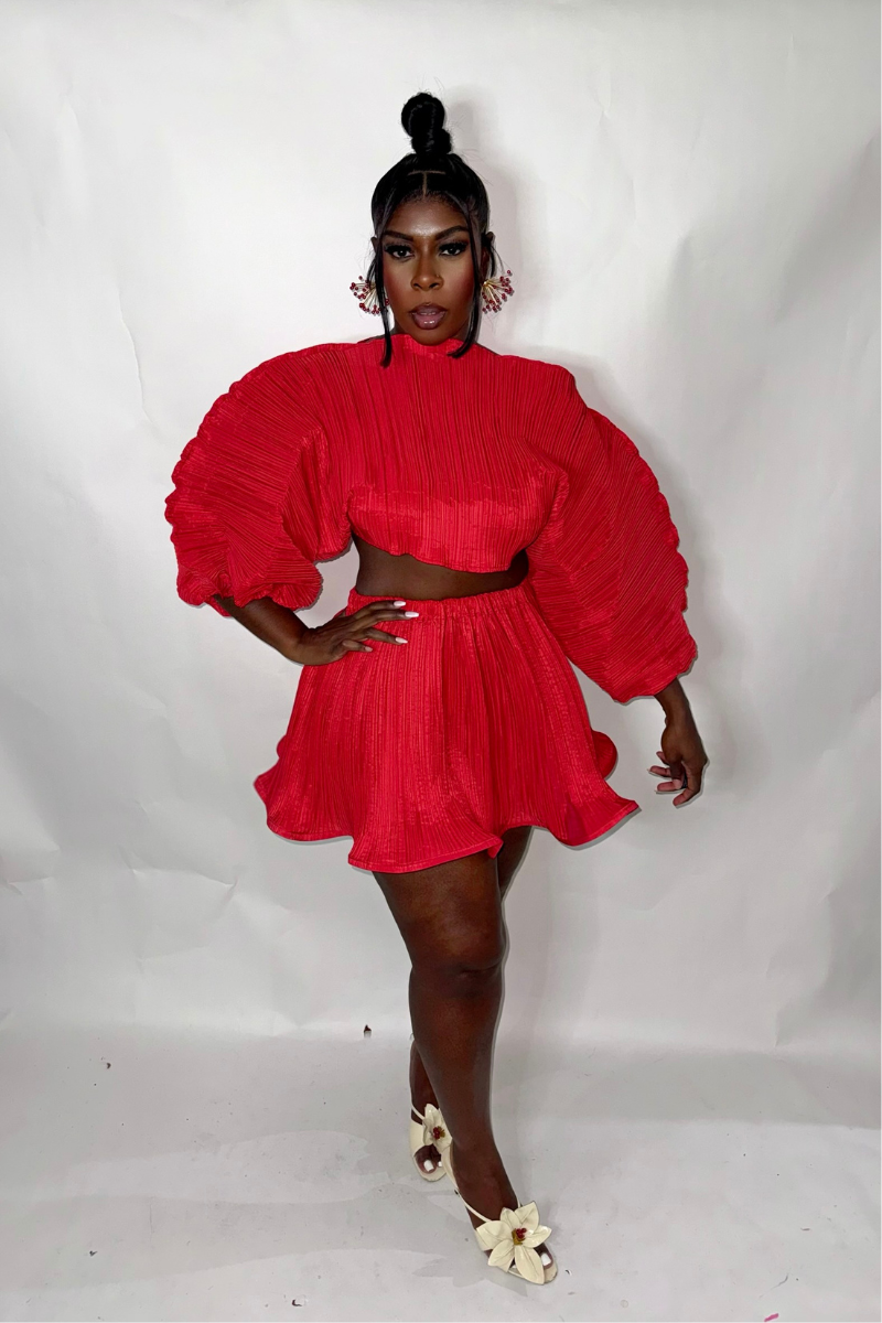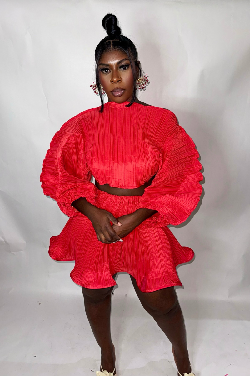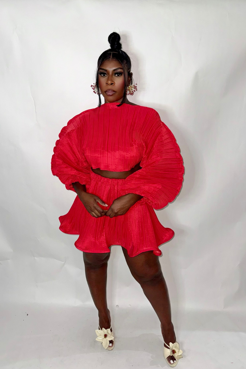 This look is a bold, sculptural two-piece set that fuses high drama festures A vibrant, fire-red cropped blouse crafted from fine, micro-pleated fabric. The exaggerated, balloon-style long sleeves are gathered at the cuffs and create a statement silhouette, while the high neckline keeps it elegant. The cropped cut subtly reveals the waistline with matching high-waisted mini skirt in the same pleated fabric. It flares out into a sculpted, ruffled hemline, creating movement and volume with each step. The contrast between the structured pleats and soft waves of the hem makes the set feel like wearable art.